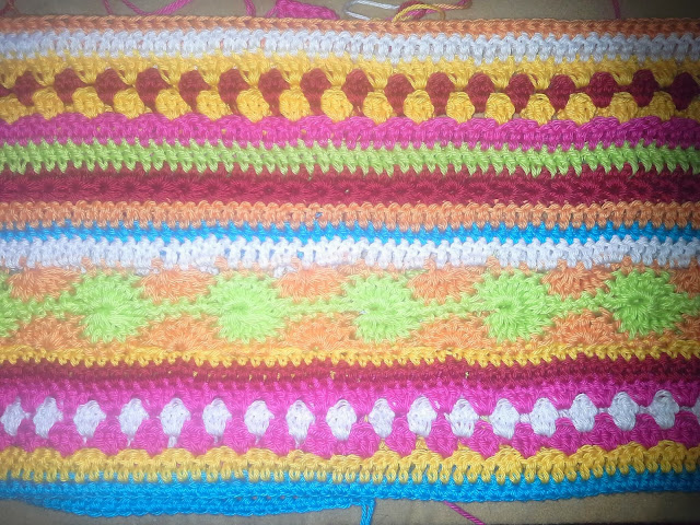 Ik heb ook een mooi aantal toeren aan mijn eigen babydekentje kunnen zetten. Omdat ik mijn meetlint steeds vergeet netjes op te bergen ik mijn haaktrommeltje, weet ik niet precies hoeveel centimeters ik al heb. Ik geloof een krappe 20 dus nog 70 a 80 te gaan. Ik ben erg blij met de kleurtjes. Het is ziet er lekker gezellig uit! Na de starstitch was ik wel ineens 3 steken kwijt dus die heb ik er stiekem weer tussen gezet bij de volgende rij stokjes...sssssst